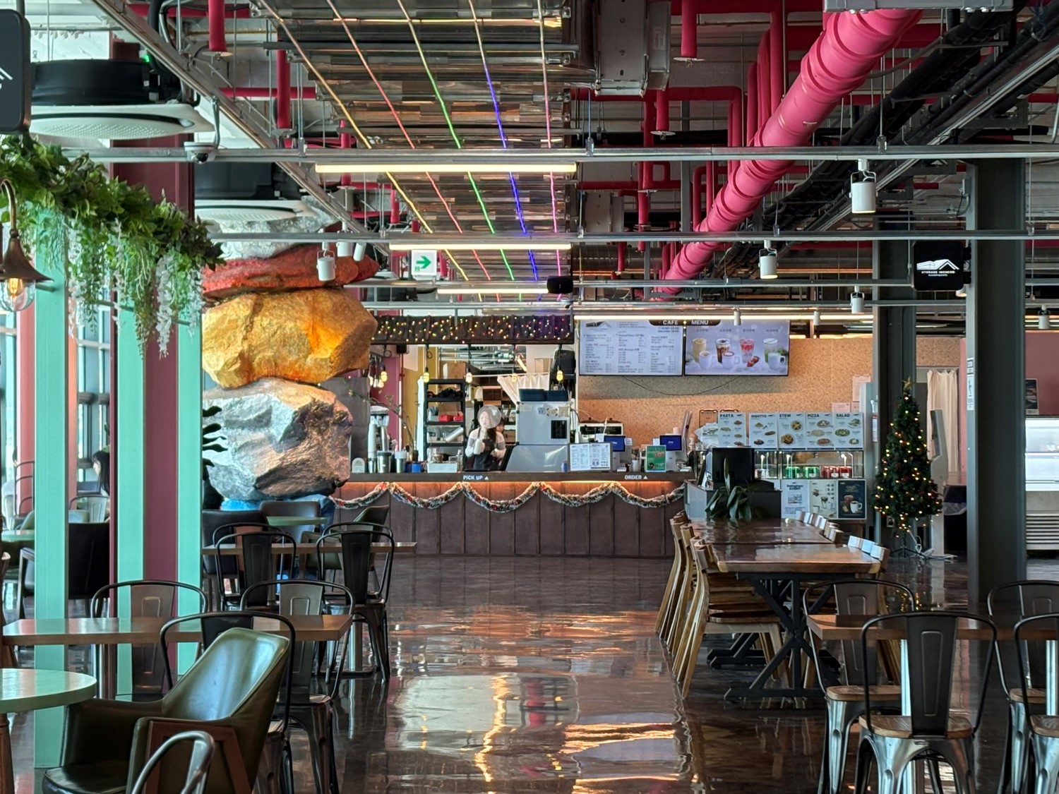 층고가 높고 통로가 아주 넓어서 유모차를 끌고 가도 옆 테이블 눈치 보지 않고 다닐 수 있고 카페를 이용하는 동안 테이블 근처에 유모차를 세워둘 수 있어서 너무 편했습니다.