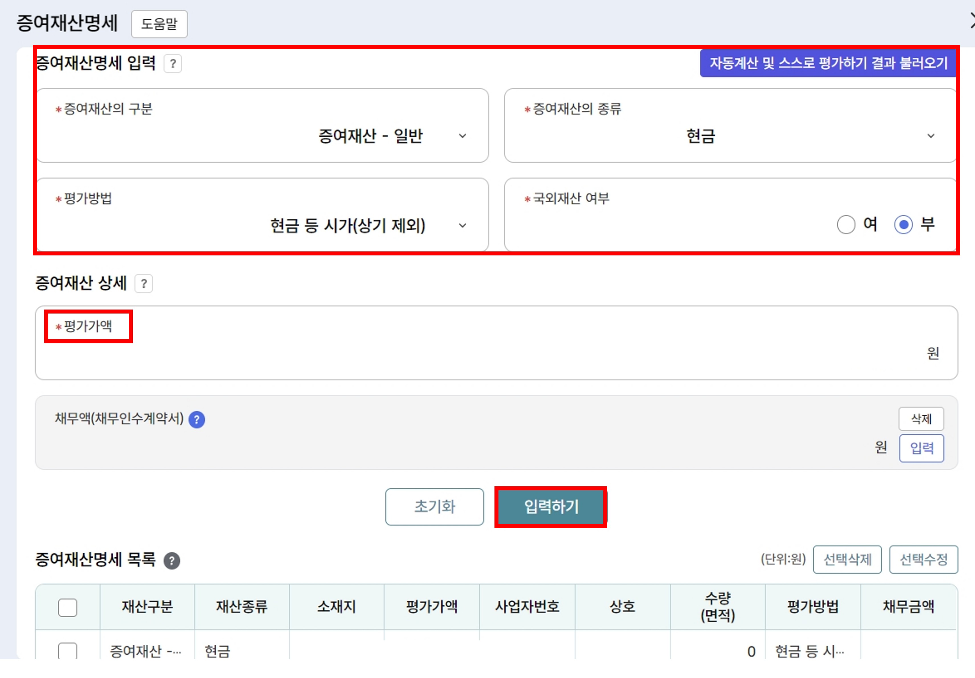 ①증여재산 평가에서 증여 증여재산가액 입력/수정 클릭 - 증여재산의 구분, 증여재산의 종류, 평가방법, 국외재산 여부, 평가가액 입력 - 입력하기 버튼 클릭