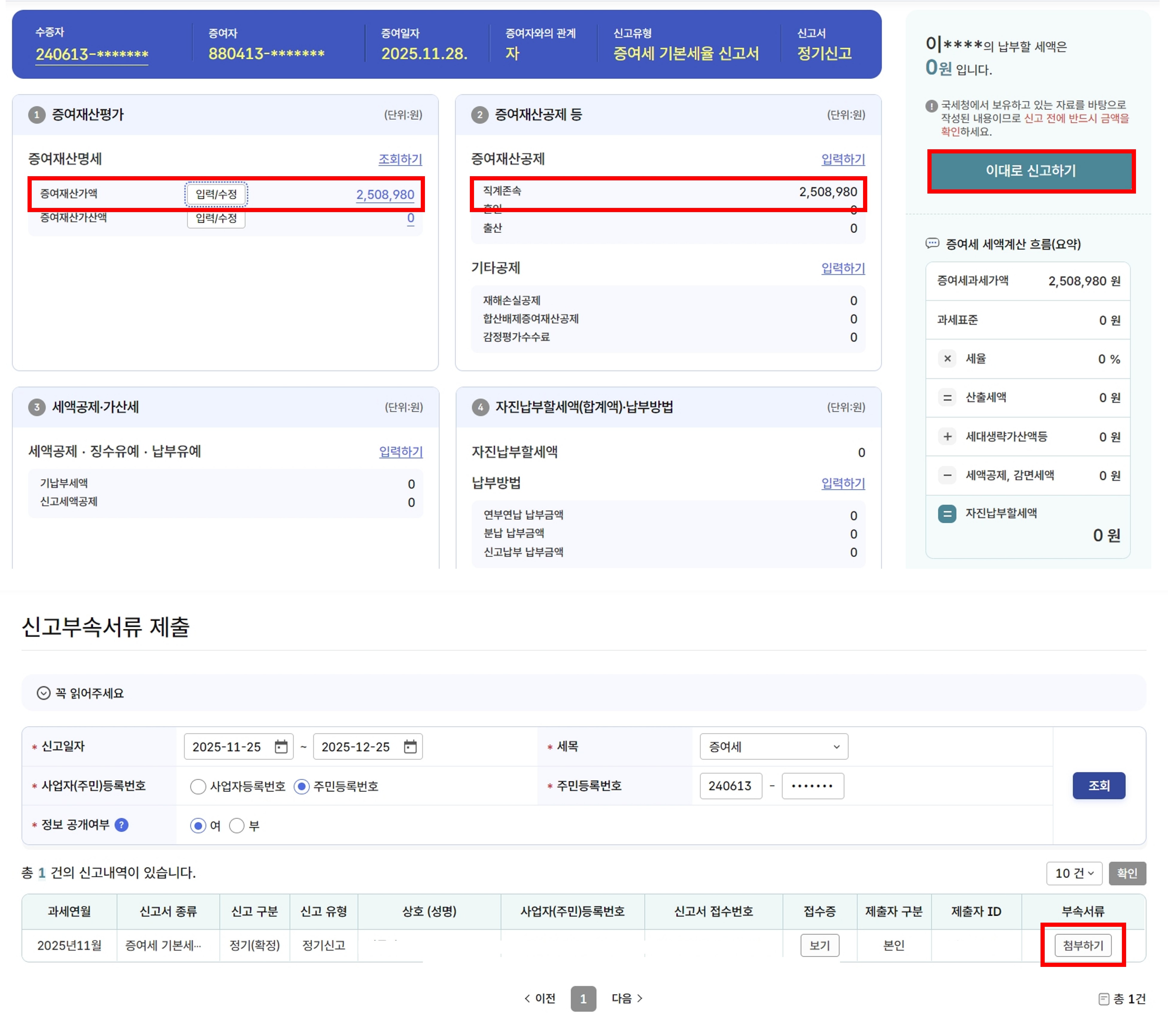 신고 부속서류는 미리 준비해두셨죠? 가족관계확인서, 기본증명서(상세), 계좌이체 내역(또는 통장 잔액 증명서)을 준비하시면 됩니다. 기본증명서는 제 명의로 로그인 후 자녀로 발급하기를 선택할 수 있어요. 준비 서류를 모두 업로드하면 신고 완료입니다. 만약 미처 제출 서류를 준비하지 못했더라도 우선 신고 후에 첨부 서류를 따로 올릴 수 있으니 걱정하지 마세요. 자녀 증여세 신고 처리는 6개월 정도 걸린다고 합니다.