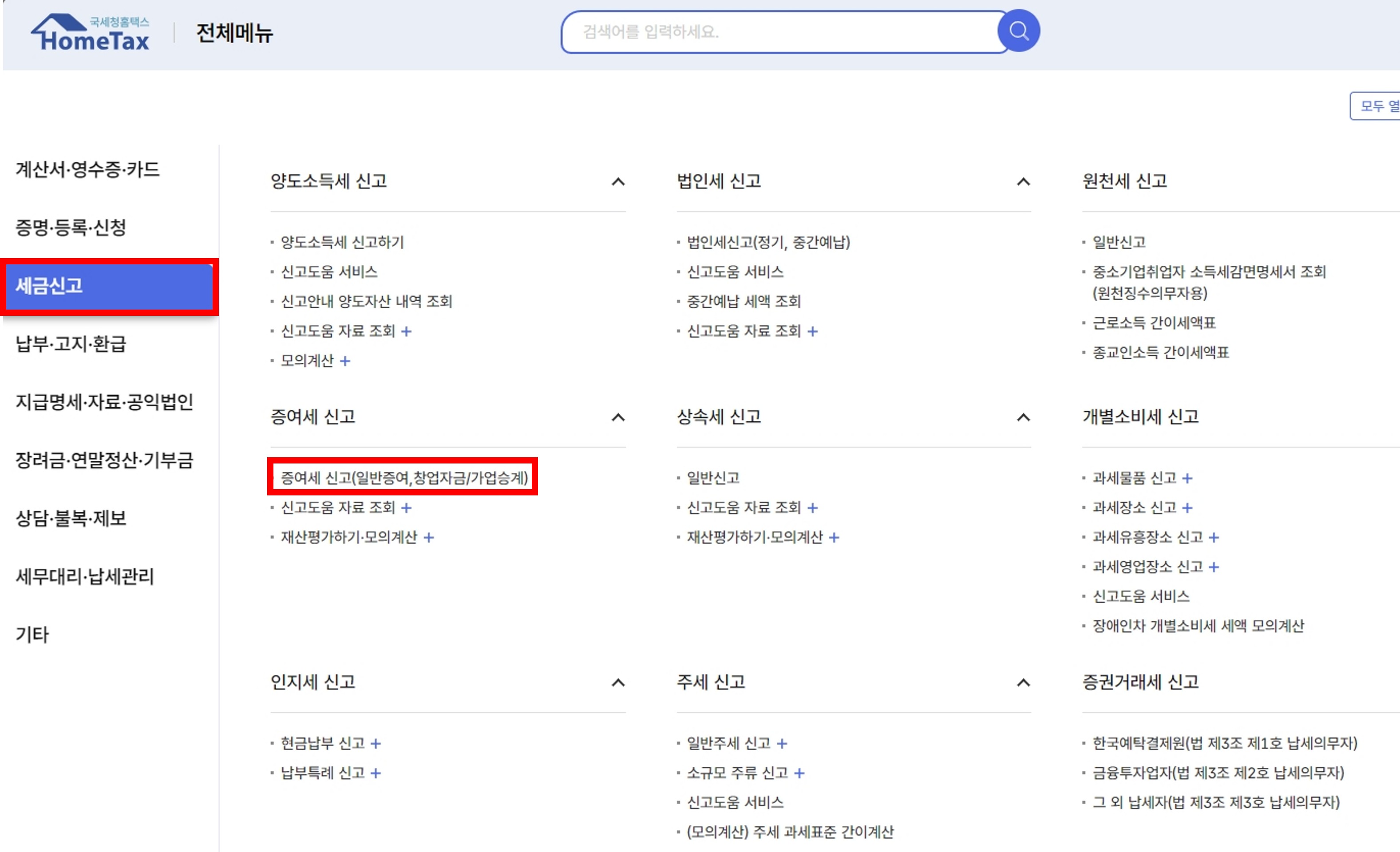 전체 메뉴에서 세금신고 클릭 - 증여세 신고에서 증여세 신고(일반 증여, 창업 자금/가업승계) 클릭